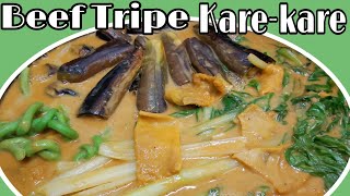 ¼ kilo beef tripe, cleaned and cut into cubes. Serve with bagoong on the side and cooked rice. Other meat can be added to the stew to beef it up a bit. Over medium heat in a pressure cooker, apply tripe, vinegar, and enough water to cover. Beef kare kare recipe is made from peanut sauce with a variety of vegetables, stewed oxtail, beef, and occasionally offal or tripe.